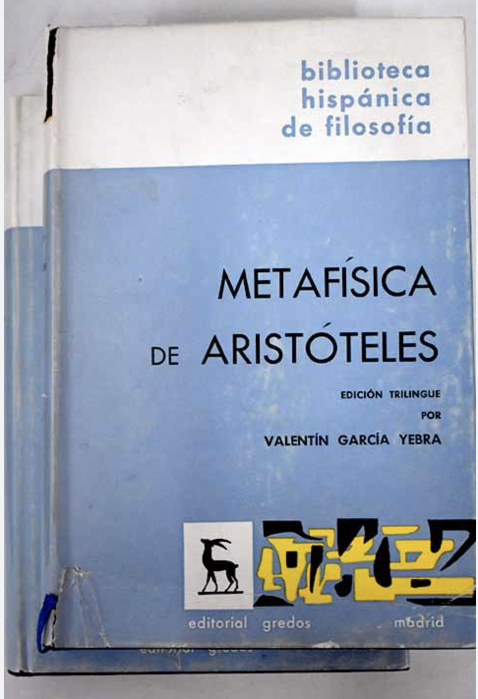Aristóteles: Metafísica, edición trilingüe por Valentín García Yebra, Gredos, Madrid, 2 vols., 1970, tapa dura con solapas